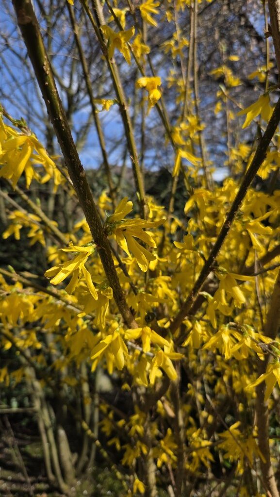 Ook wij zijn intussen goed voorbereid met een noodpakket zoals de overheid dat graag wil hebben. In de achtertuin de forsythia die heerlijk uitbundig geel laat zien. Lekker genieten in het zonnetje… mijn oplaad-momentje.