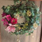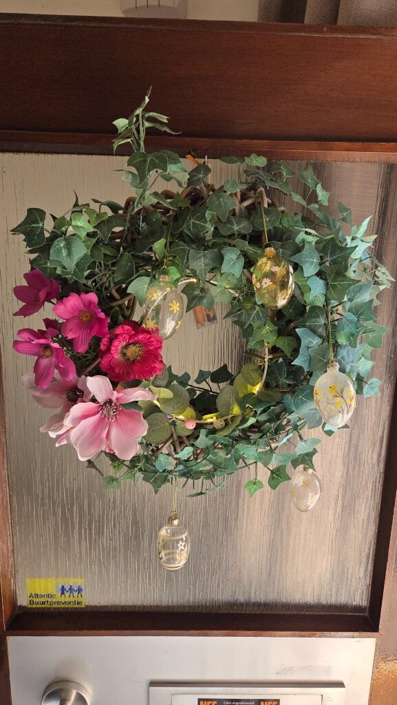 De krans met lichtjes en eitjes een beetje Pasen gemaakt.