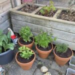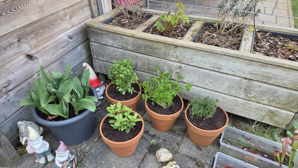 In de achtertuin lekker verse kruiden gezet. Naast de tulpen die al zo fier omhoog komen.