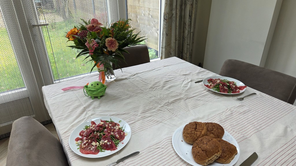 De verjaardag van Kees hebben we klein gevierd. Met een extra lekkere lunch samen en natuurlijk bloemen. De rest van de cadeautjes krijgt hij wanneer we het voor familie en vrienden vieren, want dan is ons gezin ook weer even compleet.
