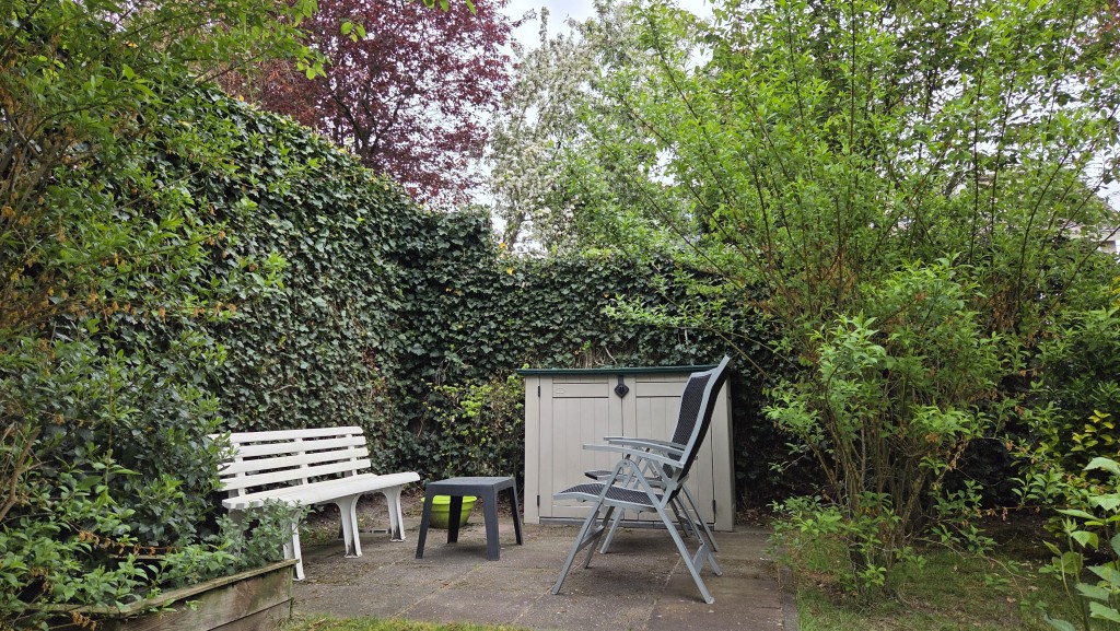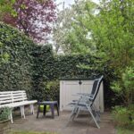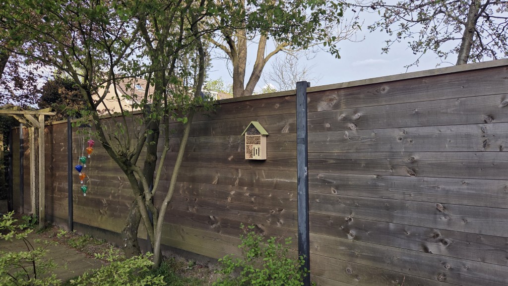Evaline en haar vriend haalden gratis boompjes en struikjes bij de gemeente en zie hier… alles is al volop aan het groeien. Een hotel voor de insecten kreeg een plekje aan de schutting.