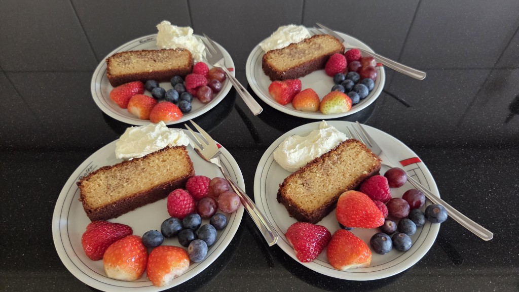 En toen er visite kwam ging ik lekker een kaneelcake bakken met wat fruit en slagroom een heerlijke traktatie.