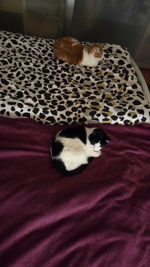 Pepsie en Maxi, altijd dicht bij ons. Pepsie heeft een nieuwe kamer met nieuwe plekjes aanvaard. Het duurde even voor ze begreep dat Tim echt niet meer terug zou komen met zijn spulletjes. Intussen is de rust weer een beetje terug gekeerd. Nu ligt ze in haar mand naast mijn bureau als ik aan het tekenen, puzzelen of op de computer bezig ben. En slaapt ze lekker bij mij op de deken op het bed. Maxi komt graag erbij zodra hij vrij is van zijn eigen kamer.